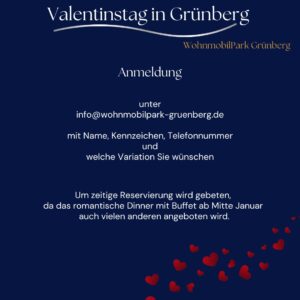 Bei Interesse bitte eine Mail mit Ihrem Namen, Telefonnummer und Kennzeichen + Wunsch des Angebots an info@wohnmobilpark-gruenberg.de