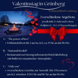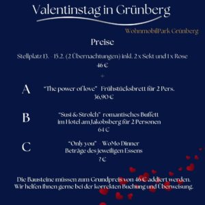Bei Interesse bitte eine Mail mit Ihrem Namen, Telefonnummer und Kennzeichen + Wunsch des Angebots an info@wohnmobilpark-gruenberg.de