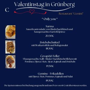 + Variation C – „Only You“ WoMo-Dinner gebracht vom Restaurant Gemini zwischen 17:30 und 18 Uhr am Sa, den 14.2. je nach Auswahl (Preise variabel je nach Gericht)